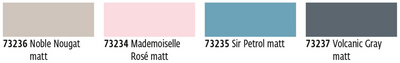 petrol, mademoiselle rosé, volcanic gray, incolore, noir